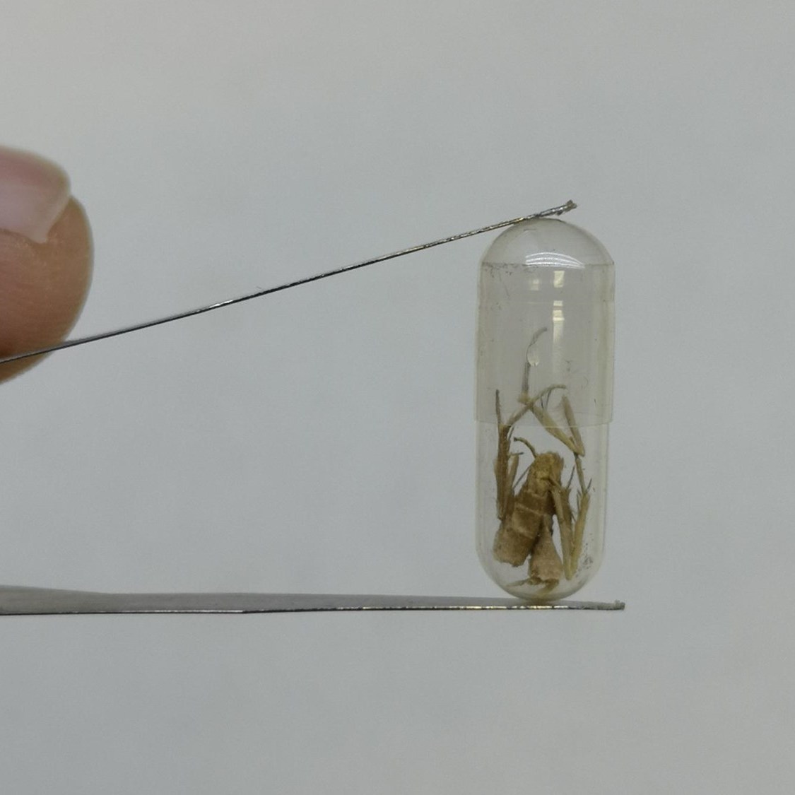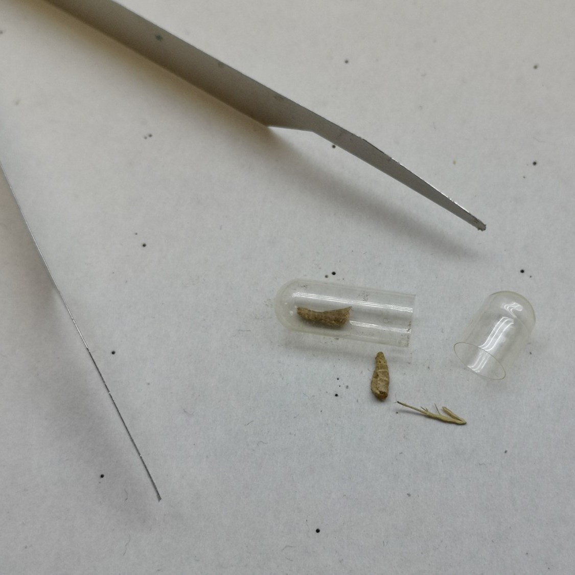 Any parts that may have fallen off, but can’t be assigned to a particular specimen, are collected and stored in a gelatin capsule. This can be useful for any researchers looking to analyse DNA. The capsule gets pinned at the end of the specimen drawer so that it is kept with the correct species.