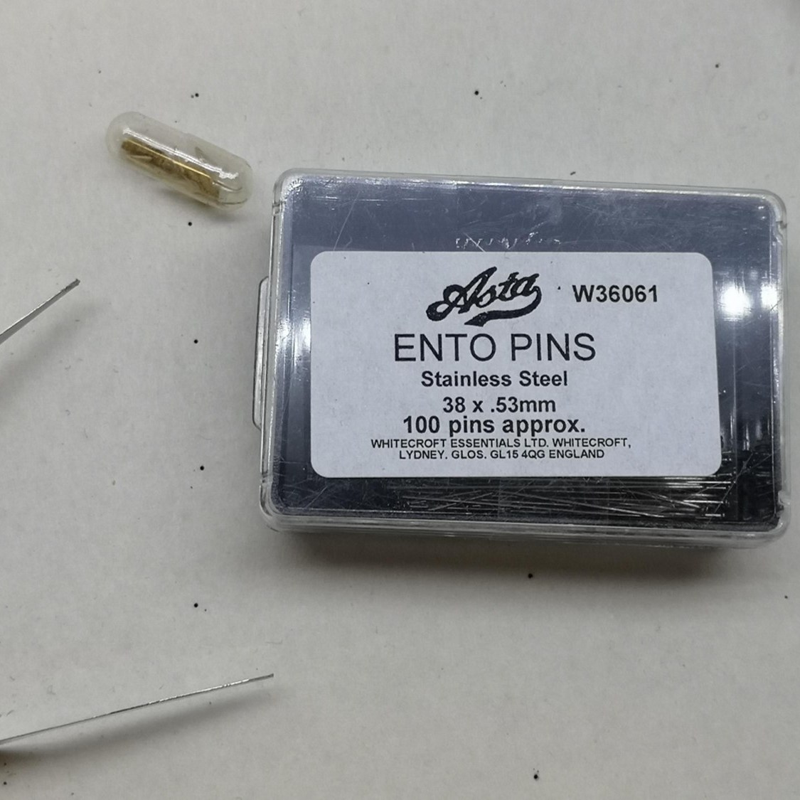 Sometimes specimens will build up verdigris; a bluish-green crust made by a chemical reaction between the old pin, the insect and oxygen. We use a small brush to lightly remove it. Pins sometimes become rusty or damaged need to be replaced.  For that job we use special stainless steel entomology pins.