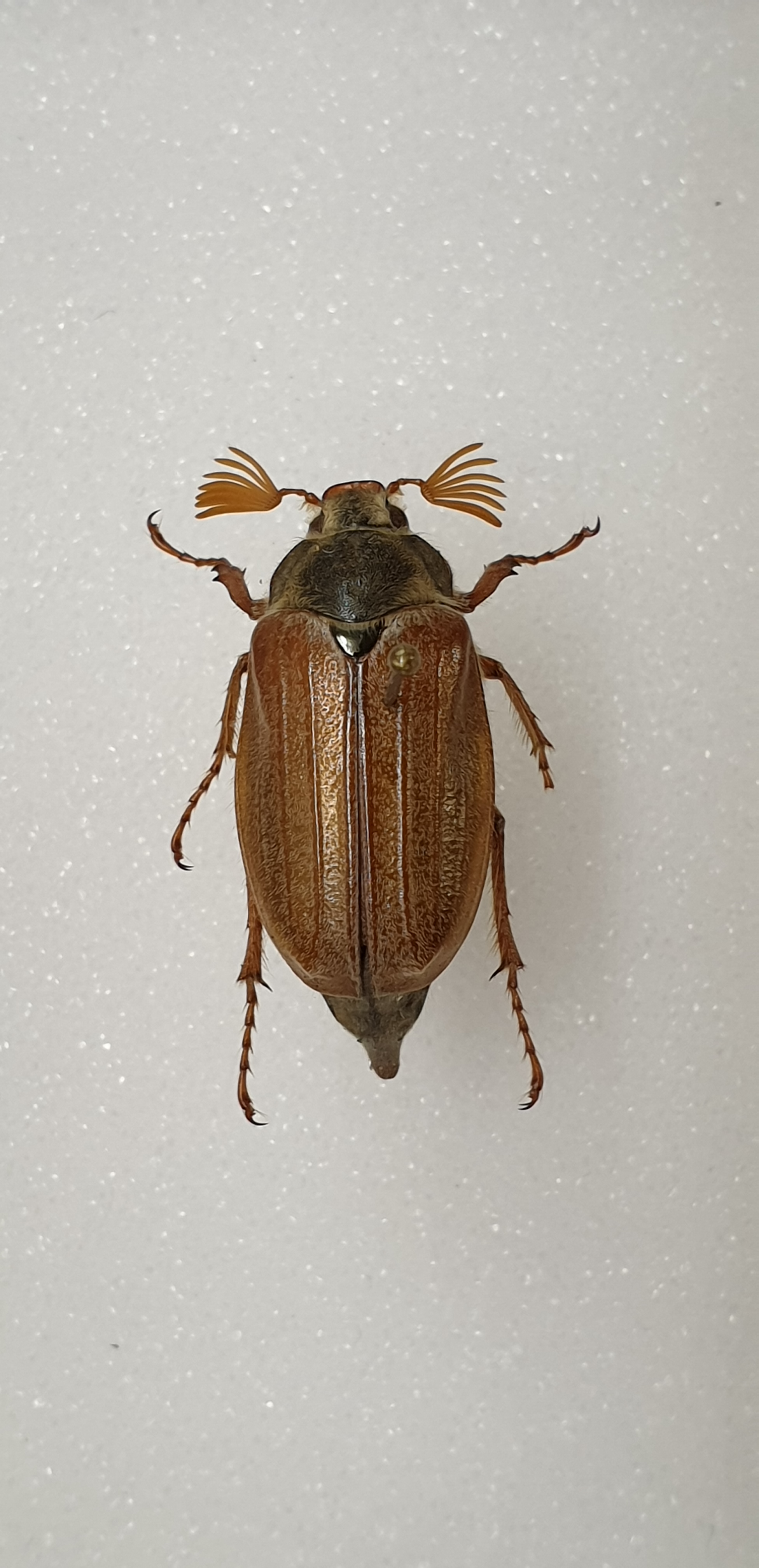 They are around 3cm long, with reddish brown wing cases and distinctive fan shaped antennae. Despite their intimidating size and noisy flight, they are actually harmless to humans. I once had one fly in the house and land on my big toe, waking me up from a nap!