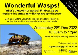 We’ll be finding out about some amazing wasp species, looking at the Museum collections to see the fantastic range of different wasps in the UK, and making our own wasp models.