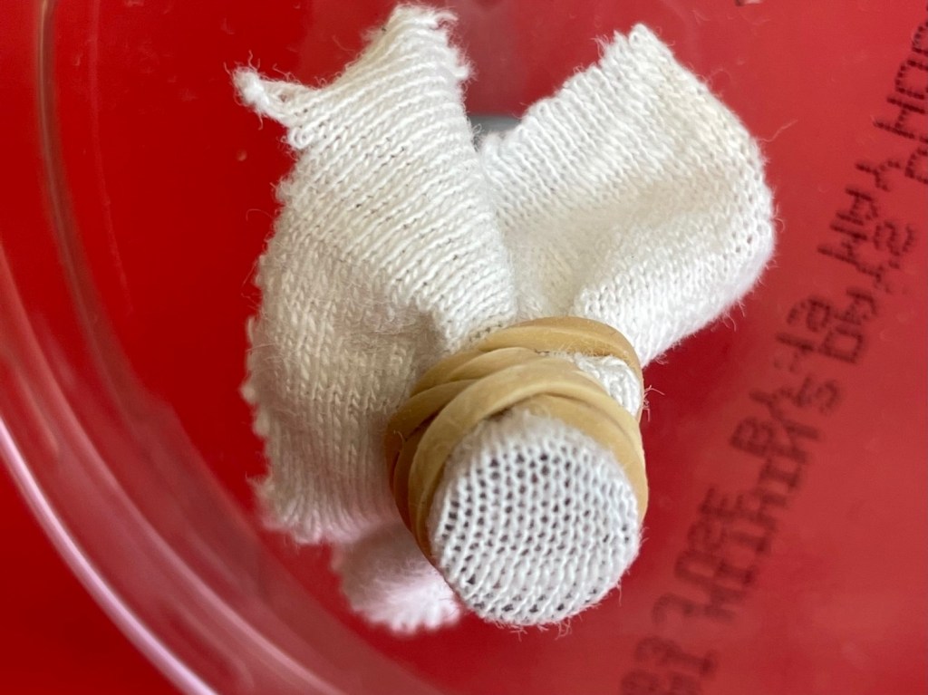 The filter goes on the short tube (or cut straw) and will stop you accidentally sucking up insects into your mouth! You can use a piece of thin cloth, old tights, or even paper tissue. Make sure it’s clean. Use the elastic band to fix the filter on to the end of the short tube that goes inside the pooter.