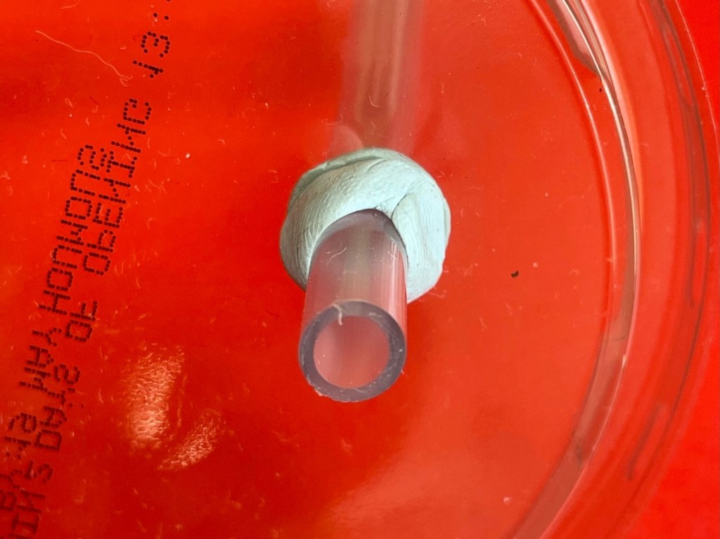 Push the short tube (or the cut straw) about 2cm into the lid. Use the plasticine or Blu-Tak to seal the hole round the tube, both inside and out.